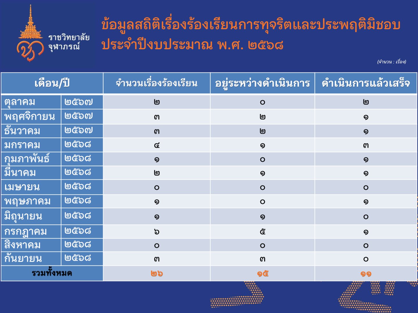 ข้อมูลสถิติเรื่องร้องเรียนการทุจริตและประพฤติมิชอบ ประจำปีงบประมาณ พ.ศ. ๒๕๖๘