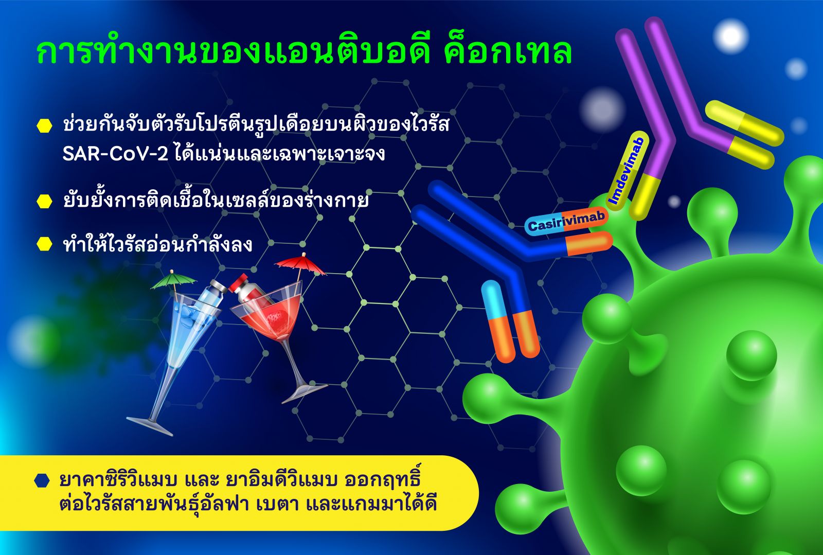 สำนักงานคณะกรรมการอาหารและยา (อย.) ของประเทศไทย อนุมัติแบบมีเงื่อนไขภายใต้สถานการณ์ฉุกเฉินให้ใช้ยา “แอนติบอดี ค็อกเทล” (Antibody Cocktail) ในการรักษาผู้ป่วยโควิด-๑๙ ได้ตั้งแต่วันที่ ๑๕ กรกฎาคม ๒๕๖๔ เช่นเดียวกับหลายๆ ประเทศ นับเป็นนวัตกรรมทางยาล่าสุดที่จะช่วยรักษาชีวิตผู้ป่วยในวิกฤตการระบาดที่อาจเกินกำลังรับของระบบสาธารณสุขของประเทศ โดยเป็นการใช้ยาคาซิริวิแมบ (Casirivimab หรือ Cas) ควบคู่กับยาอิมดีวิแมบ (Imdevimab หรือ Imb) ซึ่งเป็นโปรตีนภูมิคุ้มกันที่คัดสรรเฉพาะด้วยกระบวนการวิทยาศาสตร์และโคลนนิ่งเพิ่มจำนวนให้มาก ภูมิคุ้มกันนี้ผลิตโดยเม็ดเลือดขาวชนิดพลาสมาที่สกัดจากหนูและผู้ที่หายจากโรคโควิด-๑๙ ทำหน้าที่ต่อต้านสิ่งแปลกปลอมที่เข้ามาในร่างกายอย่างเฉพาะเจาะจง โดยยาสองชนิดนี้จัดเป็นยาแอนติบอดีที่จำเพาะในการตรงเข้าจับเชื้อไวรัสได้ดีกว่าแอนติบอดีทั่วไป เพราะจัดอยู่ในกลุ่มยาภูมิลบล้างฤทธิ์ (Neutralizing monoclonal Antibody) คือทำให้ไวรัสเป็นกลาง อ่อนกำลังลง และยับยั้งการติดเชื้อในร่างกายไม่ให้ลุกลามไปสู่ระดับรุนแรงได้