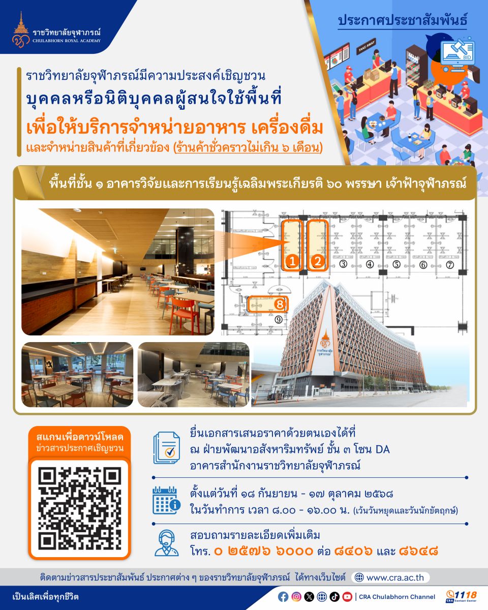 ประกาศราชวิทยาลัยจุฬาภรณ์ เรื่องการคัดเลือกผู้ใช้พื้นที่อาคารวิจัยและการเรียนรู้เฉลิมพระเกียรติ ๖๐ พรรษา เจ้าฟ้าจุฬาภรณ์ เพื่อให้บริการจำหน่ายอาหาร เครื่องดื่ม และจำหน่ายสินค้าที่เกี่ยวข้อง (ร้านค้าชั่วคราวไม่เกิน ๖ เดือน)