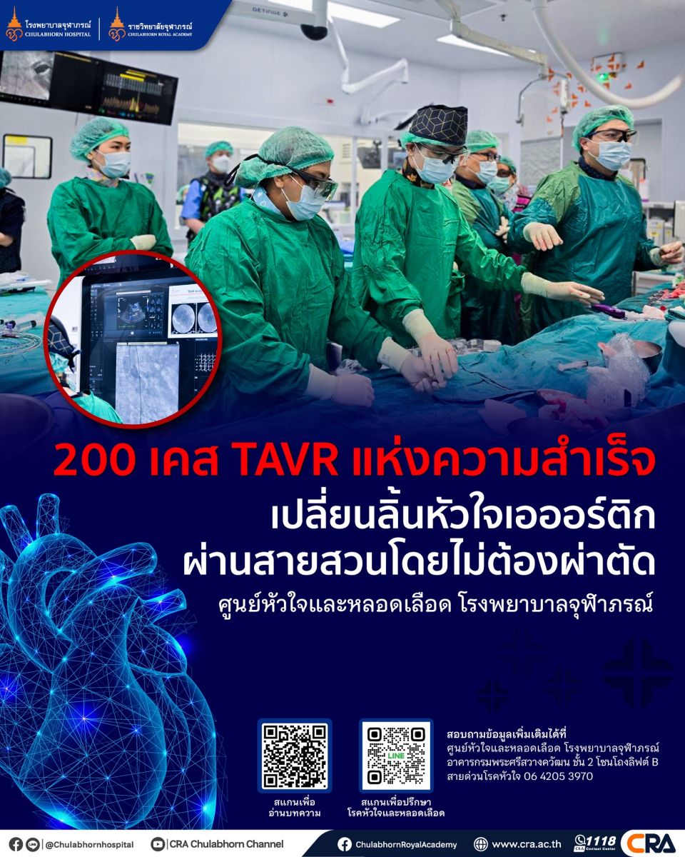 7 เมษายน 2569 – ศูนย์หัวใจและหลอดเลือด โรงพยาบาลจุฬาภรณ์ ราชวิทยาลัยจุฬาภรณ์ ตอกย้ำความเป็นเลิศด้านการรักษาโรคหัวใจและหลอดเลือด ประกาศความสำเร็จในการรักษาผู้ป่วยภาวะลิ้นหัวใจเอออร์ติกตีบ ด้วยเทคโนโลยี TAVR (Transcatheter Aortic Valve Replacement) หรือการเปลี่ยนลิ้นหัวใจเอออร์ติกผ่านสายสวนโดยไม่ต้องผ่าตัด ครบ 200 เคส มุ่งเน้นการรักษาที่ปลอดภัย แผลเล็ก เจ็บน้อย และฟื้นตัวไว เพื่อให้ผู้ป่วยกลับไปใช้ชีวิตตามปกติได้รวดเร็วยิ่งขึ้น