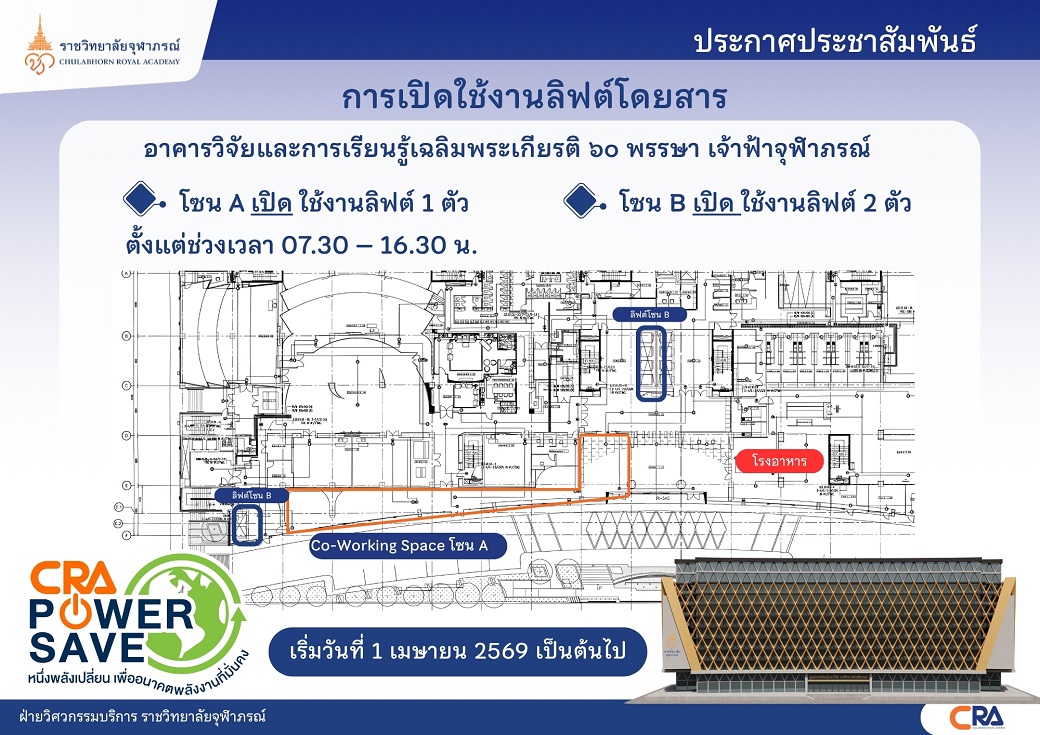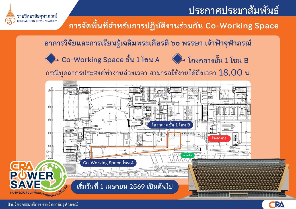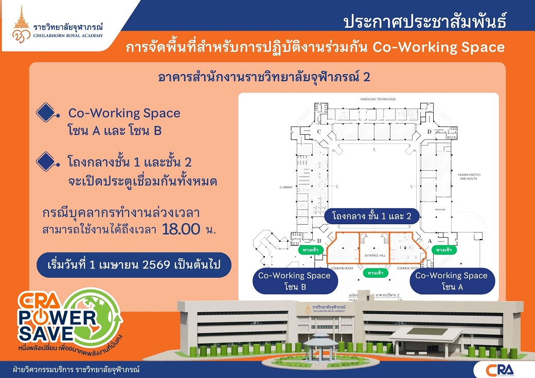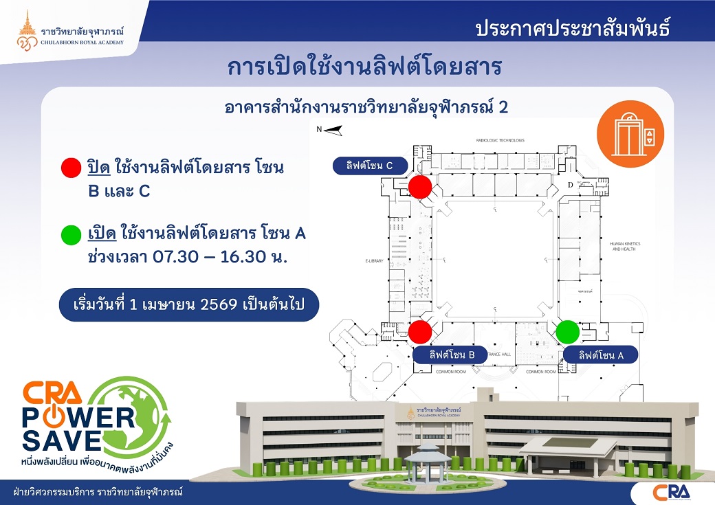 ท่ามกลางวิกฤตพลังงานที่โลกกำลังเผชิญ ความมั่นคงด้านทรัพยากรกลายเป็นโจทย์สำคัญที่เราทุกคนต้องร่วมกันหาคำตอบ ราชวิทยาลัยจุฬาภรณ์จึงขอประกาศเจตนารมณ์ในการเป็นองค์กรต้นแบบด้านการประหยัดพลังงานเพื่อสร้างความมั่นคงด้านทรัพยากรอย่างยั่งยืนและก้าวผ่านวิกฤตพลังงานโลกผ่าน ประกาศราชวิทยาลัยจุฬาภรณ์ เรื่อง แนวทางการปฏิบัติงานตามมาตรการลดการใช้พลังงานในพื้นที่ราชวิทยาลัยจุฬาภรณ์ เพื่อรองรับผลกระทบจากสถานการณ์การสู้รบในตะวันออกกลาง ประกาศ ณ วันที่ ๑๗ มีนาคม ๒๕๖๙ (คลิกอ่านประกาศ)