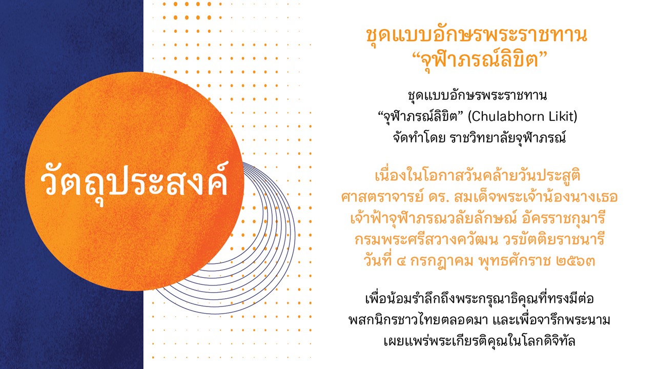 ชุดแบบอักษรพระราชทาน “จุฬาภรณ์ลิขิต” ประกอบด้วยตัวอักษรภาษาไทยที่มีโครงสร้างและส่วนประกอบถูกต้องตามอักขรวิธี และตัวอักษรภาษาอังกฤษที่ถูกต้องตามมาตรฐานสากล ซึ่งได้รับการออกแบบให้มีความอ่อนช้อยคล้ายคลึงกับยอดอ่อนของดอกกล้วยไม้พันธุ์ Phalaenopsis Princess Chulabhorn เพื่อเผยแผ่พระเกียรติคุณและรางวัลระดับนานาชาติด้านธรรมชาติและสิ่งแวดล้อมที่ทรงได้รับ โดยไม่มีการประดับลวดลายรายละเอียดมากจนเกินไป เพื่อให้สามารถนำไปใช้ได้หลากหลายลักษณะ จึงเหมาะสมที่จะนำมาใช้เป็นชุดแบบอักษรมาตรฐานราชการไทย