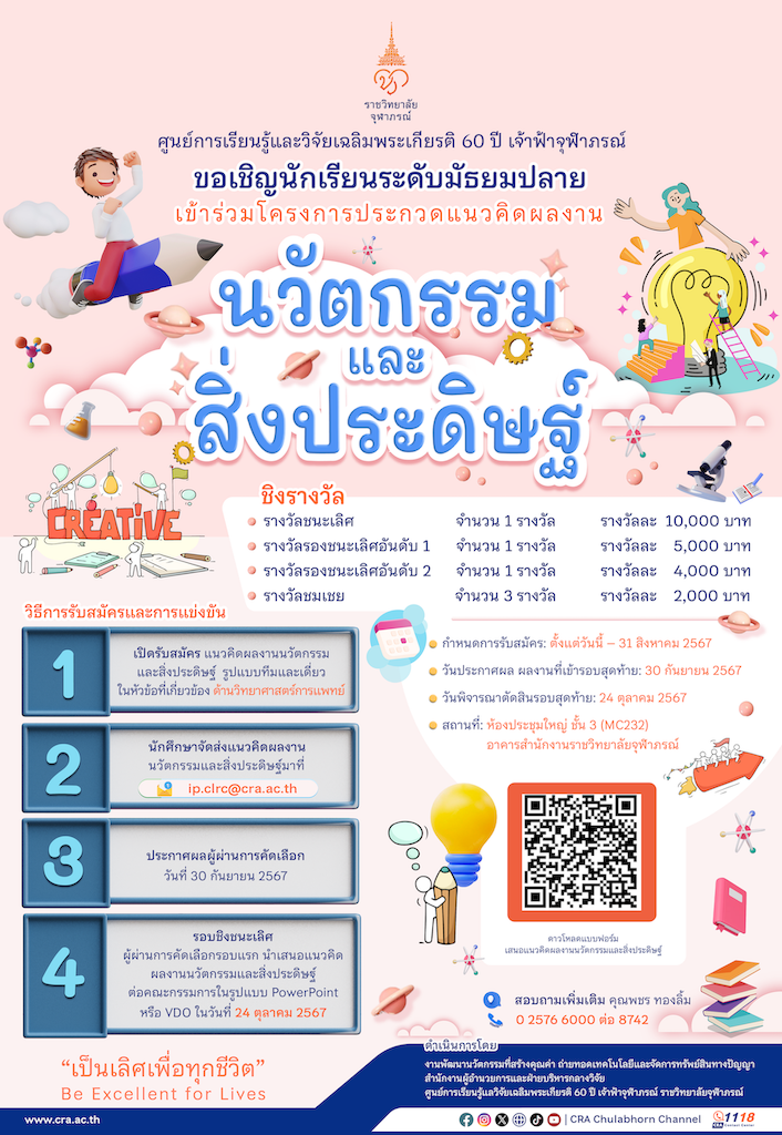 ศูนย์การเรียนรู้และวิจัยเฉลิมพระเกียรติ ๖๐ ปี เจ้าฟ้าจุฬาภรณ์ ราชวิทยาลัยจุฬาภรณ์ ขอเชิญชวนนักเรียนระดับชั้นมัธยมปลาย เข้าร่วมโครงการประกวดแนวคิดผลงานนวัตกรรมและสิ่งประดิษฐ์