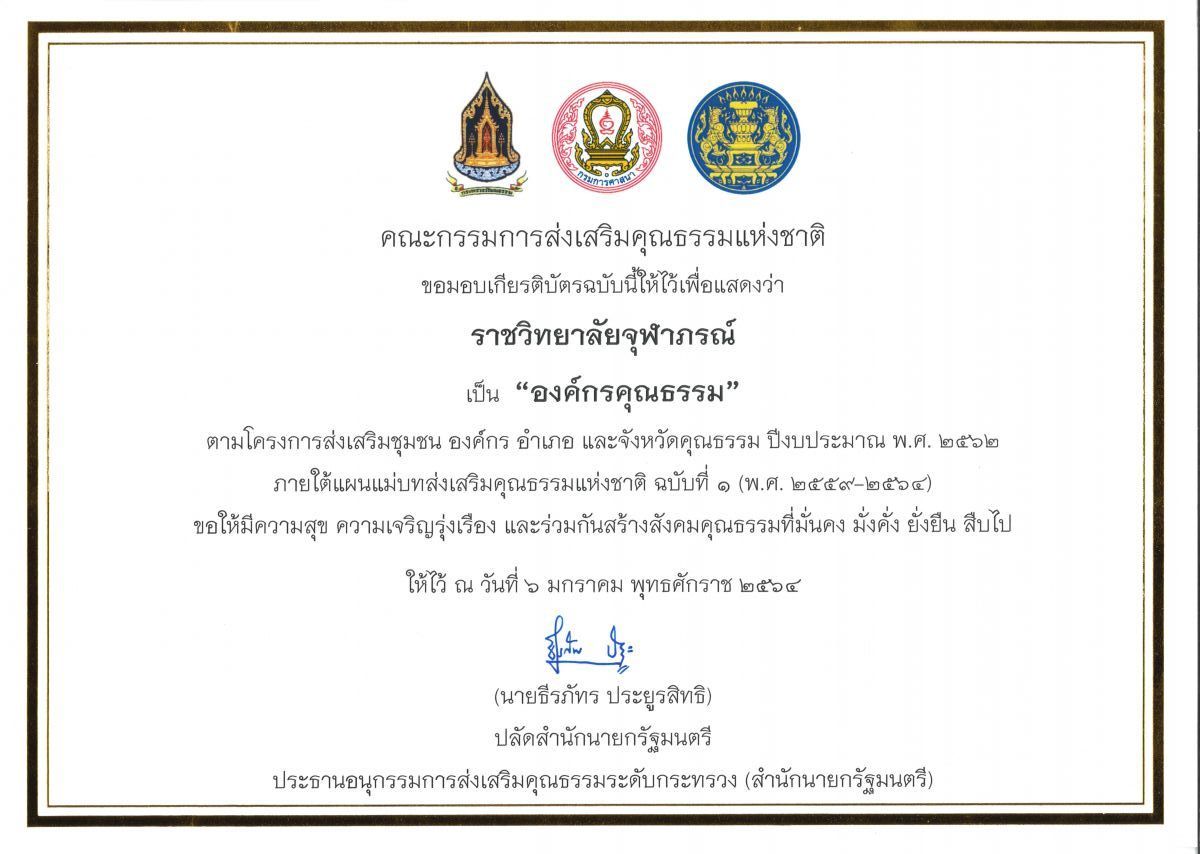 ราชวิทยาลัยจุฬาภรณ์ ได้รับเกียรติบัตรยกย่องให้เป็น “องค์กรคุณธรรม” ประจำปีงบประมาณ พ.ศ. ๒๕๖๒ จากคณะกรรมการส่งเสริมคุณธรรมแห่งชาติ