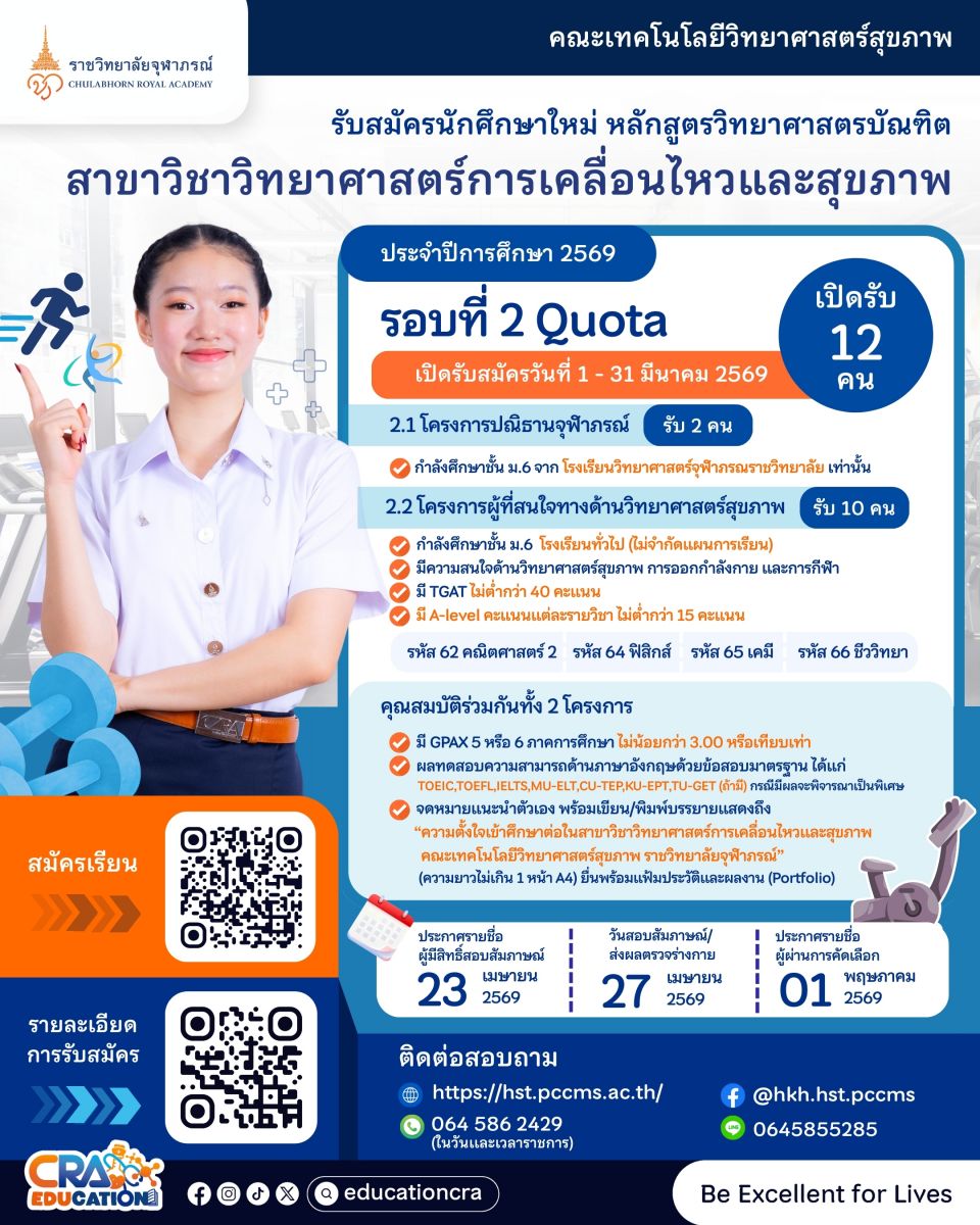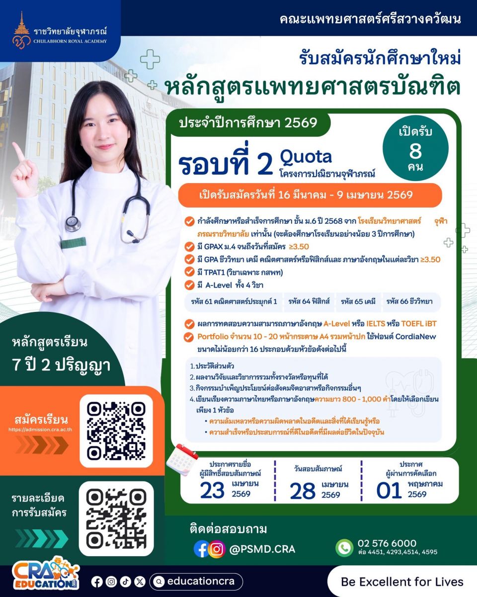 เปิดรับสมัคร TCAS รอบ ๒ Quota (โครงการปณิธานจุฬาภรณ์) ประจำปีการศึกษา ๒๕๖๙