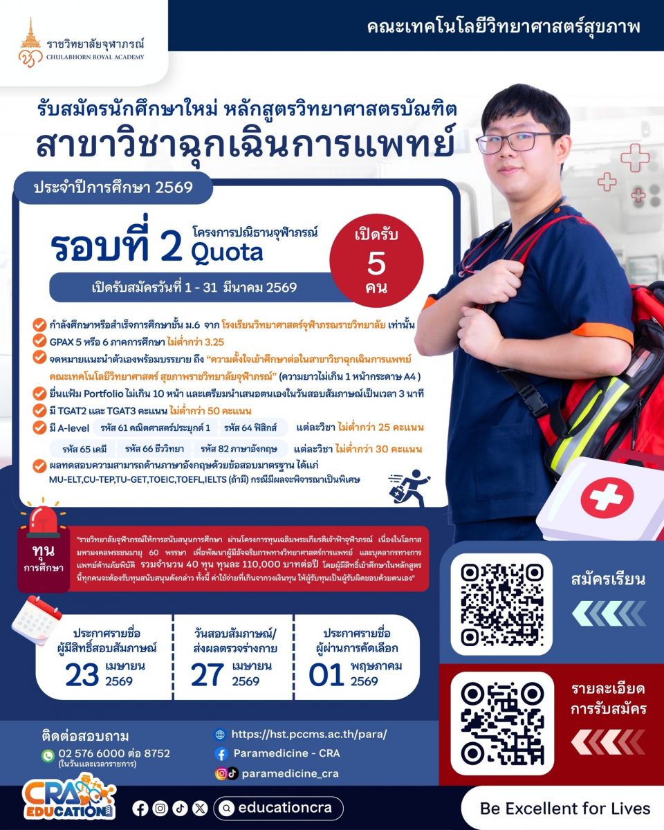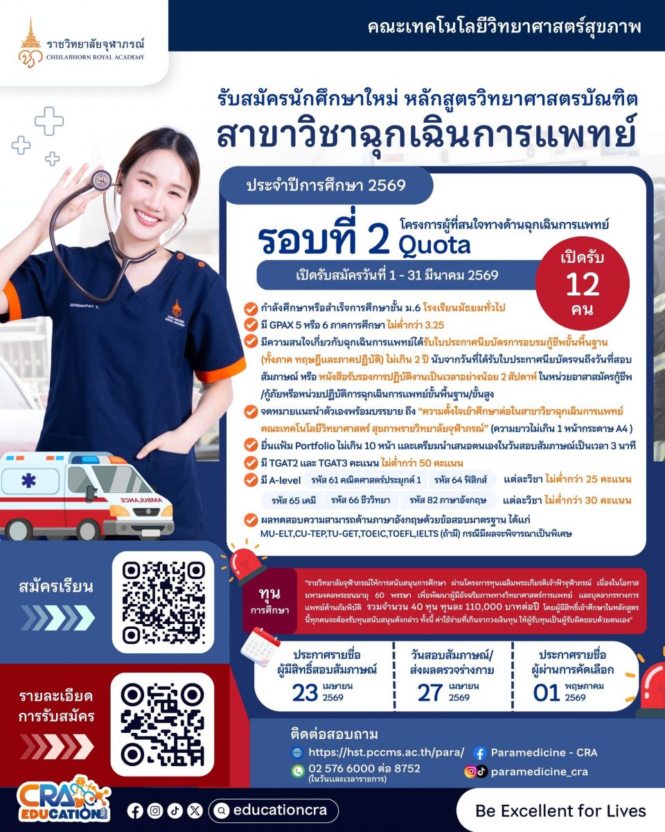 เปิดรับสมัครบุคคลเข้าศึกษา หลักสูตรวิทยาศาสตรบัณฑิต สาขาวิชาฉุกเฉินการแพทย์ รอบที่ ๒ การรับด้วย Quota